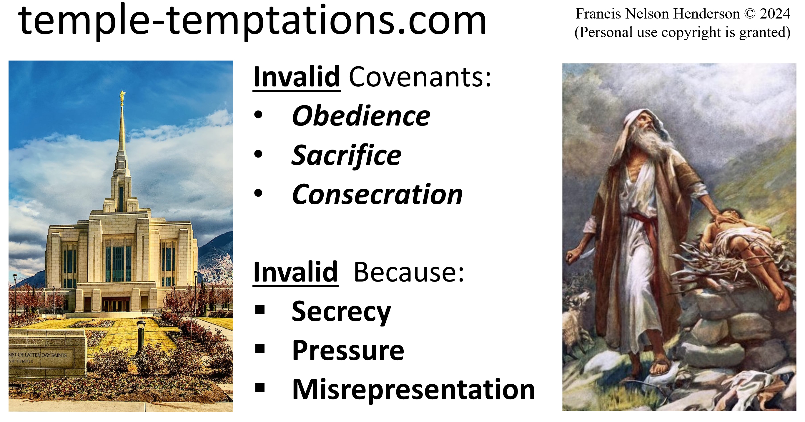 In our law which is just, self-ownership (personal sovereignty) must exist if one is to be free, hence subject to judgement under the law. Contracts, similar to Covenants, are nullified in law when the person entering the contract is: 1.) Uninformed. 2.) Pressured. 3.) Deceived. Temple Covenants are invalidated for any one or all of those same reasons.